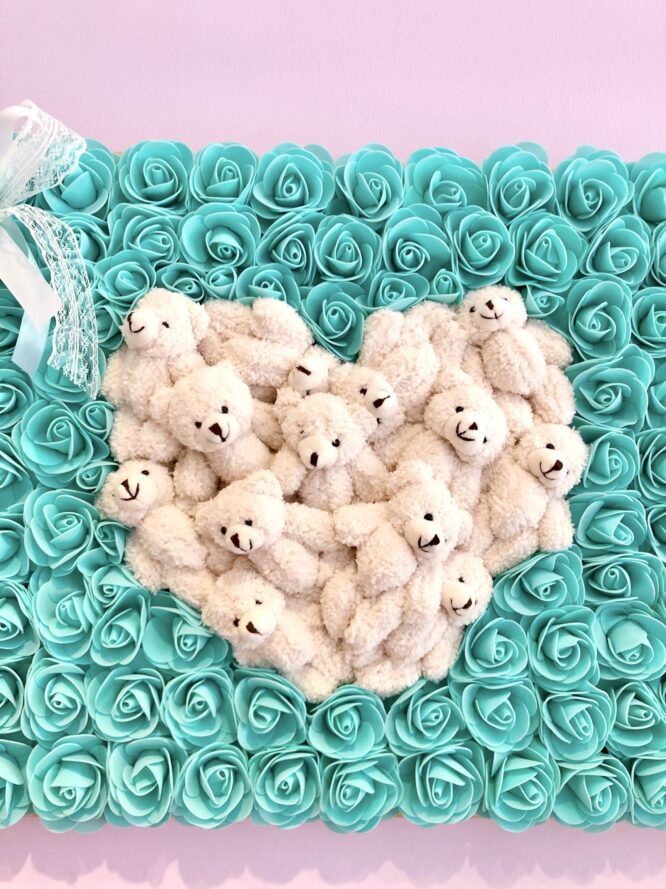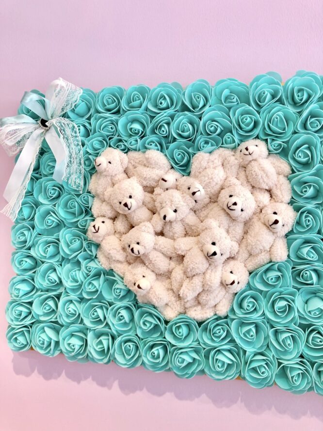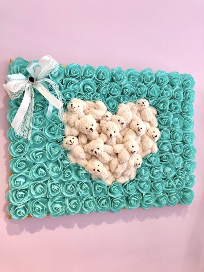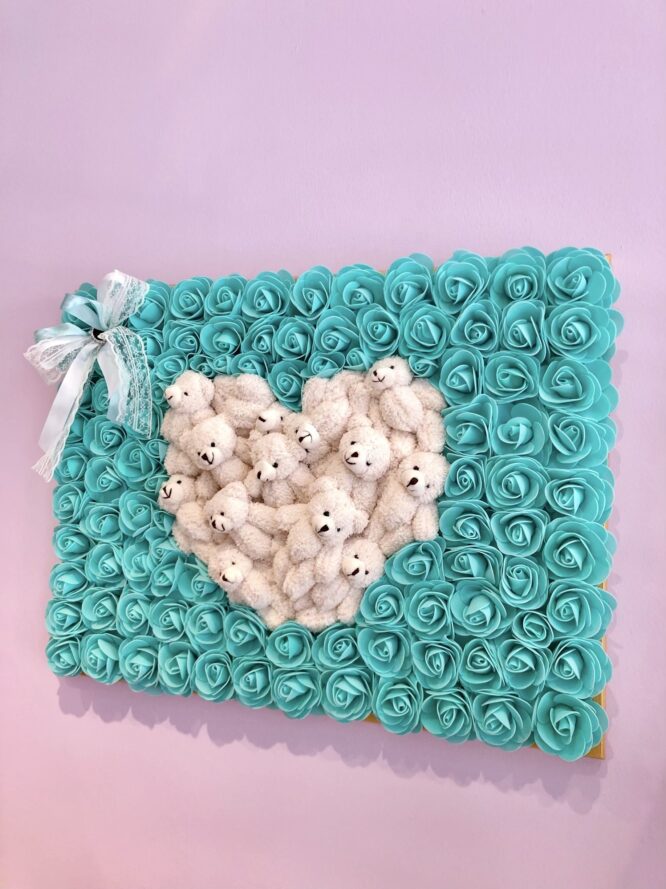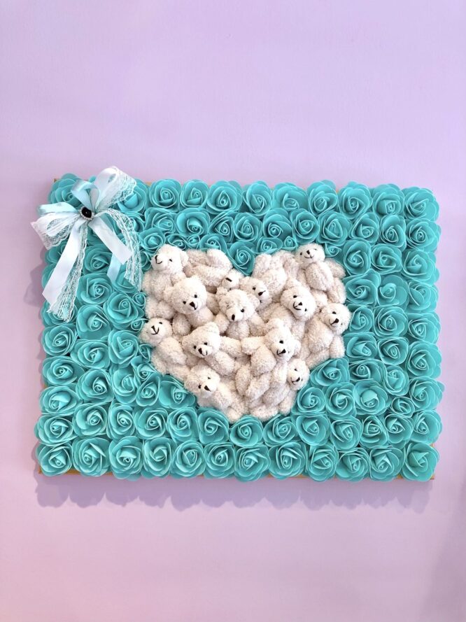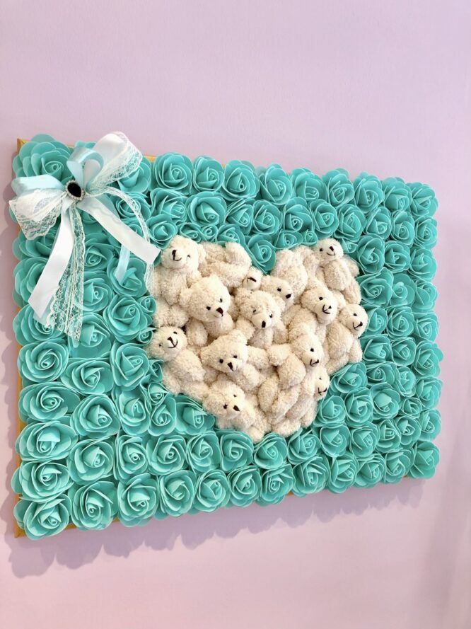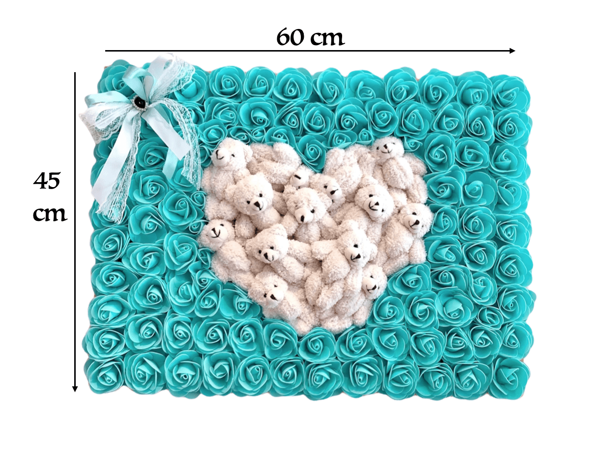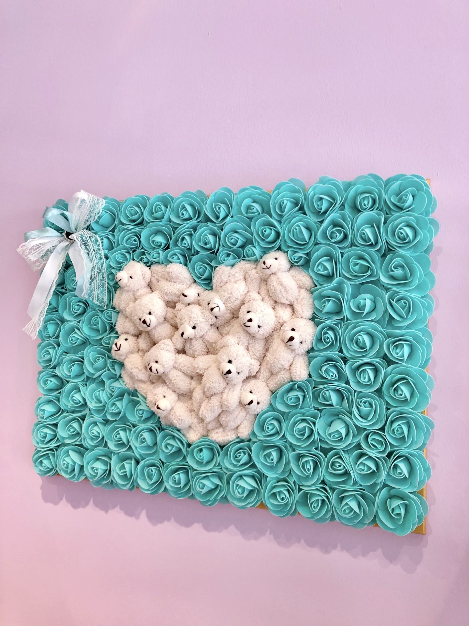 El Yapımı Özel Tasarım 3d Yapay Dekoratif Çiçekli Teddy Bear Pano 60 x 45 cm