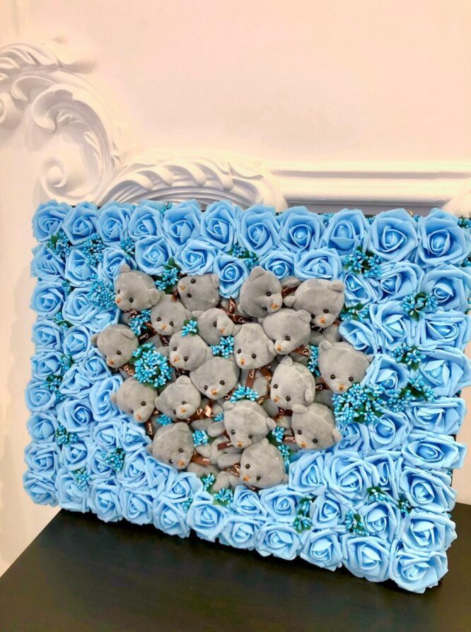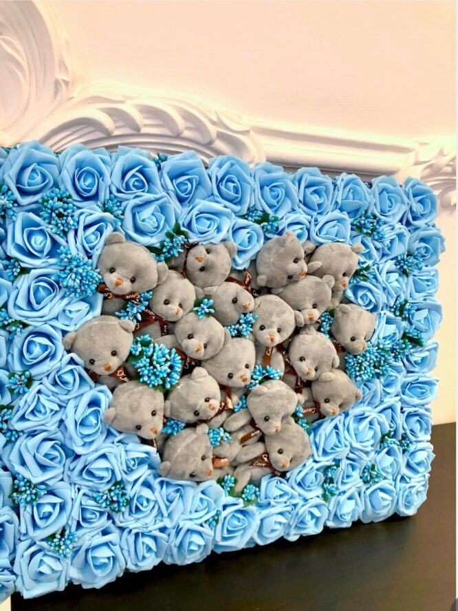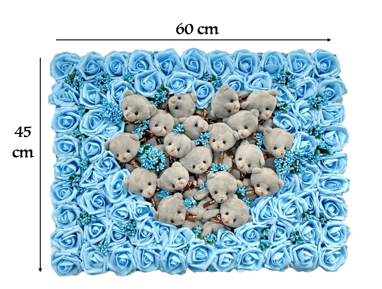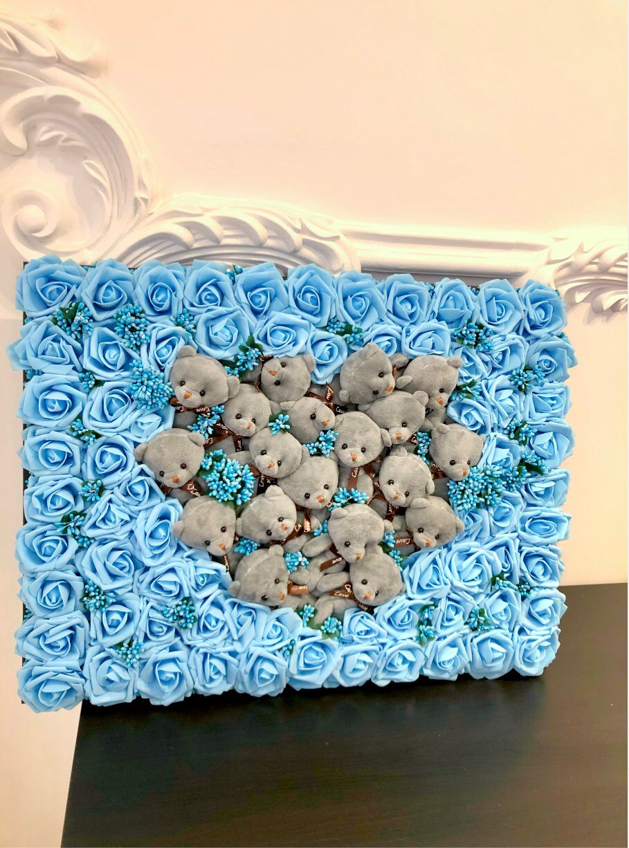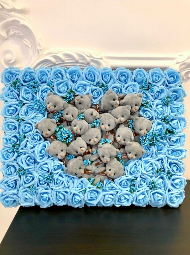 El Yapımı Özel Tasarım 3d Yapay Dekoratif Çiçekli Teddy Bear Pano 60 x 45 cm